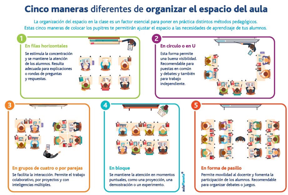 - En circulo o en U. Con este tipo de organización, todos los alumnos tienen una buena visibilidad. Es recomendable para puestas en común y debates.